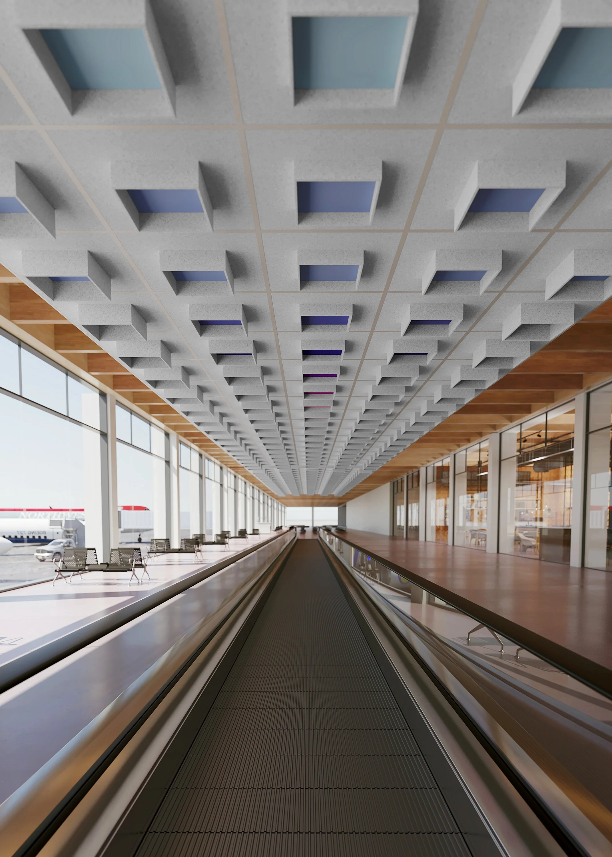 The concept behind FLOW was to create a grid that restricts the viewer’s gaze by dropping cuboids of felt from each tile in such a way that only a partial aspect of the colored background’s surface is visible. Viewing the ceiling from different angles changes the perceived colorfulness. It is impossible to grasp the objects in their entirety at a single glance. Only by changing the angle of view can the colorfulness of the tiles gradually be fully grasped. As soon as the viewer moves, the impression is created that the tiles are changing or transforming. FLOW was designed to create an interaction between the person and their environment.
